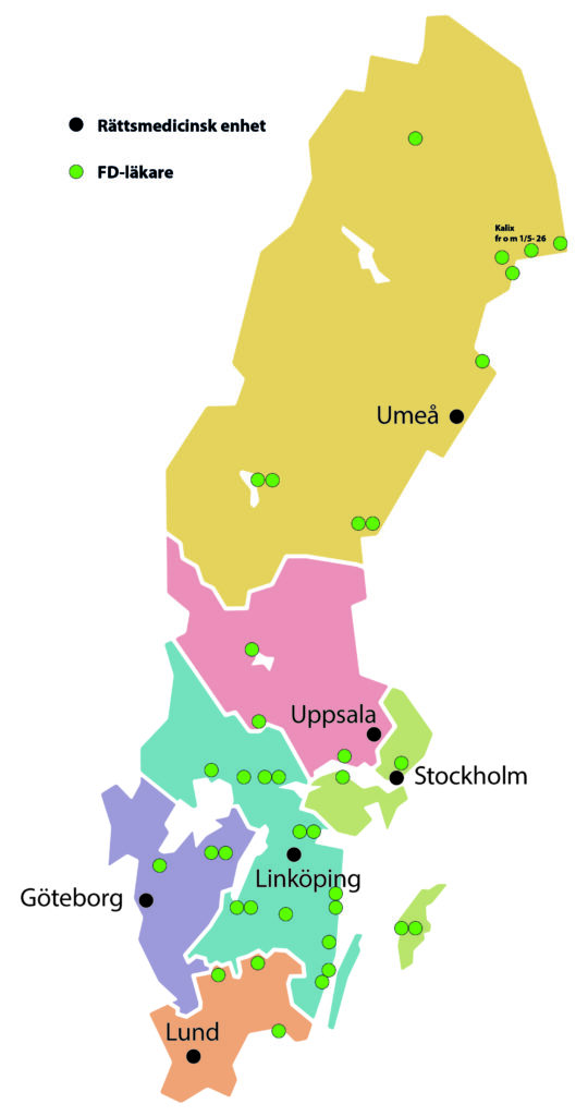 Här ser du vilka län som tillhör respektive rättsmedicinsk enhet (svarta prickar) och var de forensiska dokumentationsläkarna (FD-läkare) finns (gröna prickar).